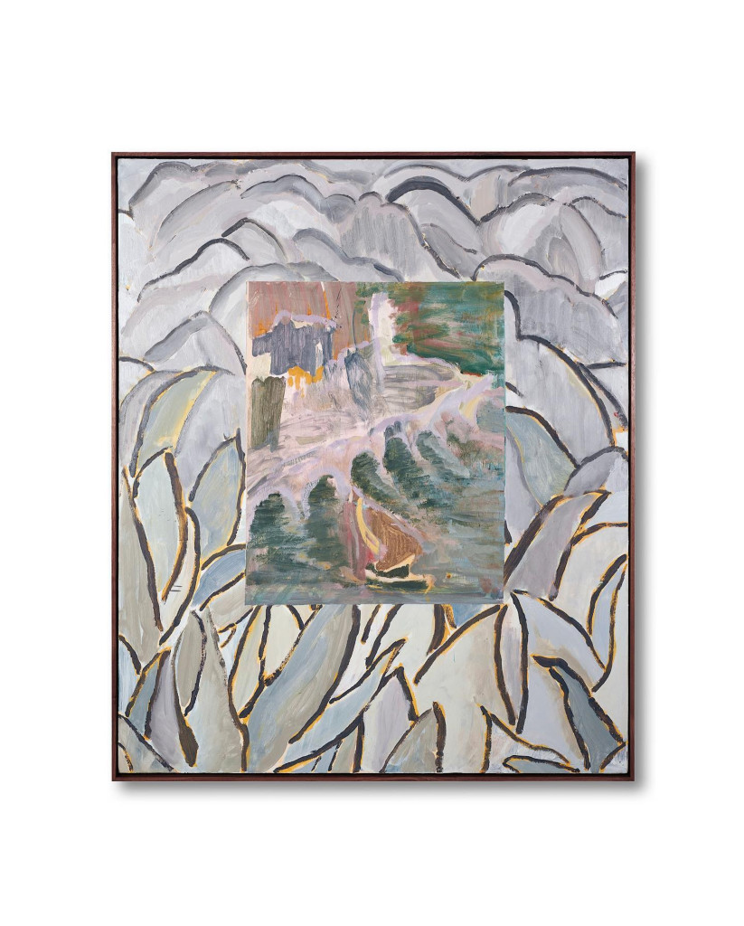 We find this still life as one might stumble upon the fieldman’s objects left out at golden hour on a summer’s evening: traces of work and solitary imbibes, but now integrated within the agrestic landscape itself. The countryside as traditionally envisioned as a place of idleness and not labour, of rung on the ladder and not common boundary is radically reimagined here, all framed by a densely sonorous border that half resembles a Matisse cut-out. A superficial reading of Banks’s paintings might take it for revelling in what British journalist Steven Poole has called nostalgie de la boue – the French term for a kind of rustic-fancying inverted snobbery, which literally means ‘nostalgia for the mud’. But, for me, these are rather going-home paintings, and landscapes that call to mind the original Greek of ‘nostalgia’: nostos ‘return home’ + algos ‘pain’. We all kill the versions of ourselves that we leave behind at home: we deliberately alter the course of our lives but then mourn the things that have not remained as they were prior to the intervention. Banks’s paintings are as much about the revolutions of life lived as they are the places in which we live.