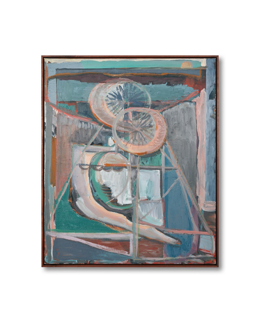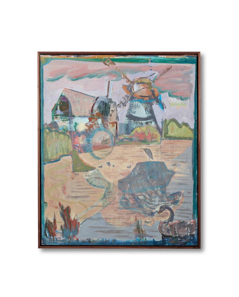 In Banks’s elliptical landscape Untitled (Mill, River, Boat) (2009-22) I’m reminded of another oft-cited moment of rural transition held in the national imagination. Like the Tulliver family’s water-powered Dorlcote in George Eliot’s The Mill on the Floss (1860, but set in 1830), which was destroyed less by the ending’s fatal flood than by the invisible forces of the new coal-fired steam economy, Banks’s scene appears to be marked already by the conditions of its own irrelevance. The world has changed. It’s already a residue of the distant past. That’s not to say there’s no activity, though, for there’s plenty in this painting: the lake mesmerically shifts from a pinkish-cream to the cobalt of a schoolboy’s toy-boat; a forbidding swan oversees its cygnet; the millrace appears suspended but holds a place.