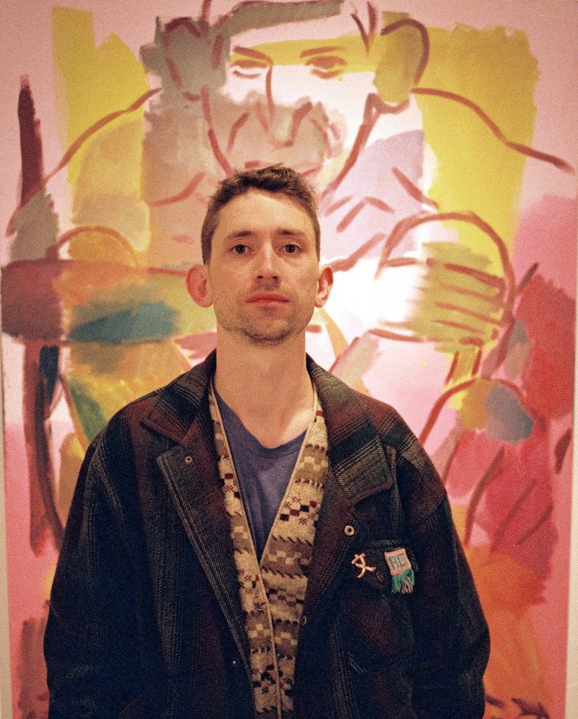 Oh Bringer of Great Joy (2022) is an unusual perspective for a self-portrait, to be sure; we seldom see so much of the artist. With that said, there is a complete sense of frontality, by which I mean the compelling organisation of perspective insofar as wherever you stand in front of the canvas, it’s as though you are apprehending each constituent part head-on and not by any relativistic sense of depth perception. The more we look the less like a man the artist is. The painting calls to mind Al Leslie’s self-portraits from 1966: larger than life-size, each square inch is seen not from below or from the side, but from the front.As Gibbs has arched and crossed his knees in an X-shape, the painting is organised by an extraordinary architectonic layering of panel-like body parts: the shins, the forearm, the heavy-set shoulders, and a face that is to a primate what Pablo Picasso is to the minotaur. The artist is rendered as a kind of sexual force, staring back as though he knows we are staring at him through the proxy division of a transparent glass pane. The radical vulnerability unnerves us. Notice, too, the relationship between the eye and the fingers holding the paintbrush: the marrying of our most powerful sense, sight, and our greatest physical aptitude, the hand. If the rest of the body is pared back, lost amidst an overlaying of yellow and then jungle-green, then the hand reaches to us. We are held at a distance but in full proximity, dare we say intimacy, with the artist at his barest.