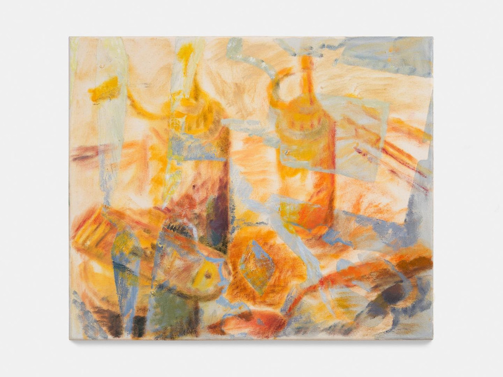In Buff Accretion (2022), which titularly refers to polished glass, a hue of yellow, and the gradual accumulation of layers, Gibbs depicts the artist’s materials: oil pot, brushes, a scraping spoon, palette knives, the tools in the studio. A torrent of golden light floods the table while the temperate tones of blue flecked with white form angular layers that pulse to the canvas edge like tide against rocks. There’s something reminiscent of Giorgio Morandi’s still lives in the way that the scene is arranged: the occasional moment of ostensibly prosaic objects on a table takes on a revelatory sense of meaning in having their own reason for being there. Gibbs never paints straight from the tube. Whereas some artists use their brush to mix colours on the palette or directly on the canvas, which often makes for a more ‘painterly’ or muddier mark, Gibbs disperses the colours with a knife on the palette and then uses a brush to apply onto the canvas. While this invariably makes for a more precise compositional terrain, and forms cleaner and more well defined colours, it still appeals to the smudged landscapes of memory that we try and recall against the pressures of forgetfulness.