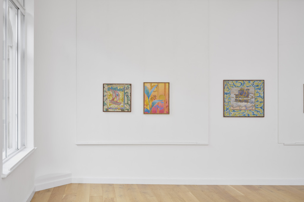 As such, the artists describe themselves as ‘two arcadian minds away from arcadia, lost somewhere in urbania’, a neologism partly invented by Gibbs, and partly a reference to those places in cities where the throng of a metropolitan centre and suburbia coalesce, as a kind of oxymoron. But it is also clear what Gibbs is referring to here: his still lives of tidied up plates and cups, of playgrounds at night (and so not when it is being used, useful, and active), often bear the residues of places where excitement and mundanity mix, happily and unhappily. ‘One of the things that bring these objects together is the closed geographical space: the fence, the kitchen sink’, Gibbs reflects: ‘you’re not painting the cake, you’re painting the crumbs on the plate after it’s been eaten.’ When I look at Ablution (2024), a picture of cups, pans, and cutlery on the kitchen- side which is now bathed in luminescent pinks and blues, and where the rectangular tiles on the far wall seem to apply a quasi-cubist logic to the overall composition, I think of the way that table- top of dinner party joviality is this table-top of domestic labour. I think of Nash’s tension between the functional and the futile.