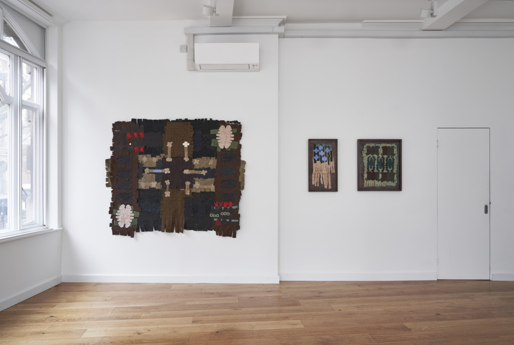 Let’s look at two examples: suitably, a companion piece. In Walls on Doors / Free Pattern (2023) and Walls on Floors (2023), Jauncems creates dynamic rectangular forms of cross-hatched patterns that zig-zag and overlap, and gesture to the unfinished quilted designs of the celebrated Lithuanian cobbler Paulinas Kaluina. Partly resembling insects or clumsy bugs that scuttle around the ceilings and skirting boards of our rooms, the patterns are excitingly complex and multifaceted, and are made from cut-outs of a felt ice cream toy set belonging to her daughter. Both works emerged out of Jauncems’ desire to glue her daughter’s bedroom with wallpaper made entirely like this – a room made of ice cream! – but she acknowledges the process will probably never be realised. ‘I find that imagining and planning and living with the idea’, she writes, ‘gives me more excitement than the probable result.’ All makers know that to imagine living, breathing, and sleeping in a world of art can be more intoxicating than the actuality.