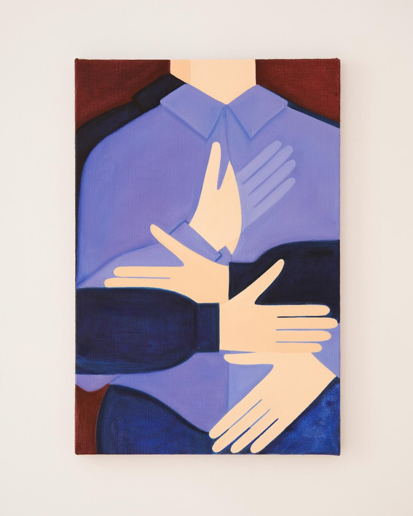 In his essay ‘Phenomenology of Perception’, written in Paris in 1945, the French philosopher Maurice Merleau-Ponty writes that there ‘is not a single word or human gesture – not even the habitual or distracted ones – that does not have a signification.’ In other words, every gesture of our hand, or every word that we have spoken perhaps a thousand times, is freighted with meaning. I thought of Merleau-Ponty’s essay as I spent an afternoon in MacGarry’s studio, which is lit by one of those wonderful glass-panelled sky ceilings that make you think you are waiting for a train at the Gare Saint Lazare, and where Merleau-Ponty might have stood, holding his pen or pursing a cigarette, in 1945 as his city was liberated. There, I looked closely at The Step (2024) in which two figures in blue shirts—one coal-navy, the other a mauve-cobalt blue—stand close, facing in the same direction, which is to say they face us; indeed, they are stood close enough that the figure behind, in the coal-navy, has put both arms around their companion in an embrace that oscillates between comfort and control. Our focus, in the mauve-cobalt, puts one hand on their own chest, in between the buttons, and the other across their body. Two of the pairs of hands are arched 45 degrees; the other two at 90. The composition has a remarkable geometry. You spend a moment wondering whether this is a painting about love or restraint until you realize it is about both. Often, we separate out love and freedom as two noble but irreconcilable aspirations: you can either be loved or you can be free. That’s it. But sometimes we want to be held down; to make the choice not to choose. In this way, The Step contains a tenderness that is reminiscent of Joanna Piotrowska’s monochrome studies in human touch and feeling, such as her untitled images of wandering and caressing hands that layer one on top of the other like a palimpsest of reassurance. They, too, hold down as a way of expressing love.