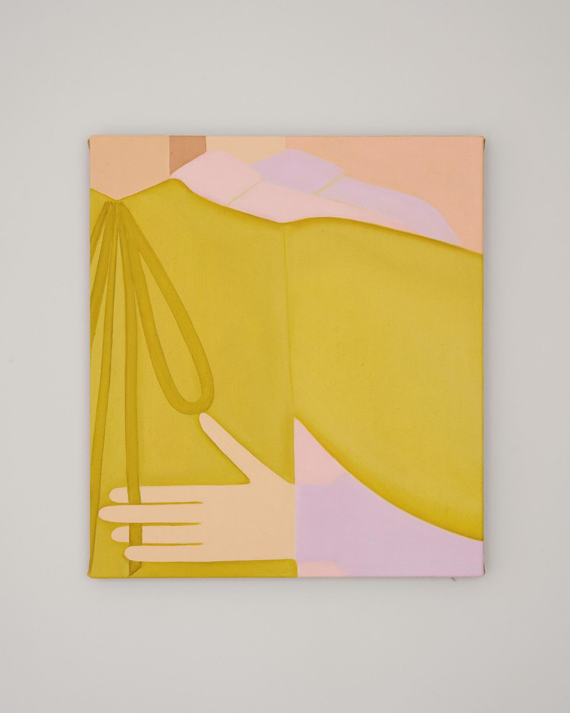Many of MacGarry’s works are made with oil on flax canvas while others, like Ties (2024), were produced on herringbone canvas which offers such a rich material effect that plays sleight of hand with our senses. As we see (and almost touch, by seeing) the minute diagonals and lines, reminiscent of a tweed jacket, we are surprised—not unlike encountering Meret Oppenheim’s furry teacup and saucer for the first time—that the subject feels so at odds with the form. But, like the great camp stage designer and painter Domenico Gnoli, whose close-up representations of herringbone ties and crisp collars were both so voguish and yet so vulgar, MacGarry is an artist who contains multitudes. In her pictures of bodies, of dress, and of interiors, this is an artist who speaks in a unique vocabulary to remind us of the secrets, the joys, and the intimacies of our lives, in both noise and silence.