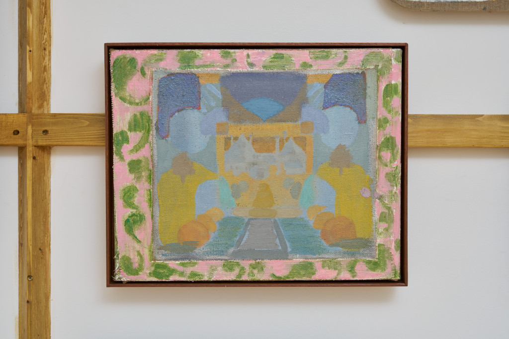 In many of the works in Banks’ show — among them Fishing Boat (2018-25), Shipwreck (2012-25), Stately Home (2008-25), English Riviera (2012-25) and Wading Birds (2011-25) — the landscape is bordered by a painted ‘frame’, into which its imagery spills, or else is met by what looks like a wall of stylized foliage or abstract pattern, rendered in a colour palette that might be harmonious, or distinctly discordant. The artist has called these areas the ‘suburbs’ of his compositions, and has spoken of how they allow him to deploy ‘two logics, two modes of description, two different ways of working’ on the same support. Considering this device, we might recall not only the way that painters of the past such as Wassily Kandinsky and Howard Hodgkin made use of the frame as a site of facture, but also the long history of paintings-within-paintings (Banks cites Vincent Van Gogh’s Self-Portrait with Bandaged Ear, 1889, which features the Dutch artist’s limber rendition of a Japanese print, as a particularly exhilarating example). In the works in Gone to Seed, one of the purposes it serves is surely to remind us that what we are witnessing are not landscapes at all, but rather their depiction, ‘framed’ by a particular mind. Reality, if it exists at all, does so beyond these images, and outside our perceptual reach.