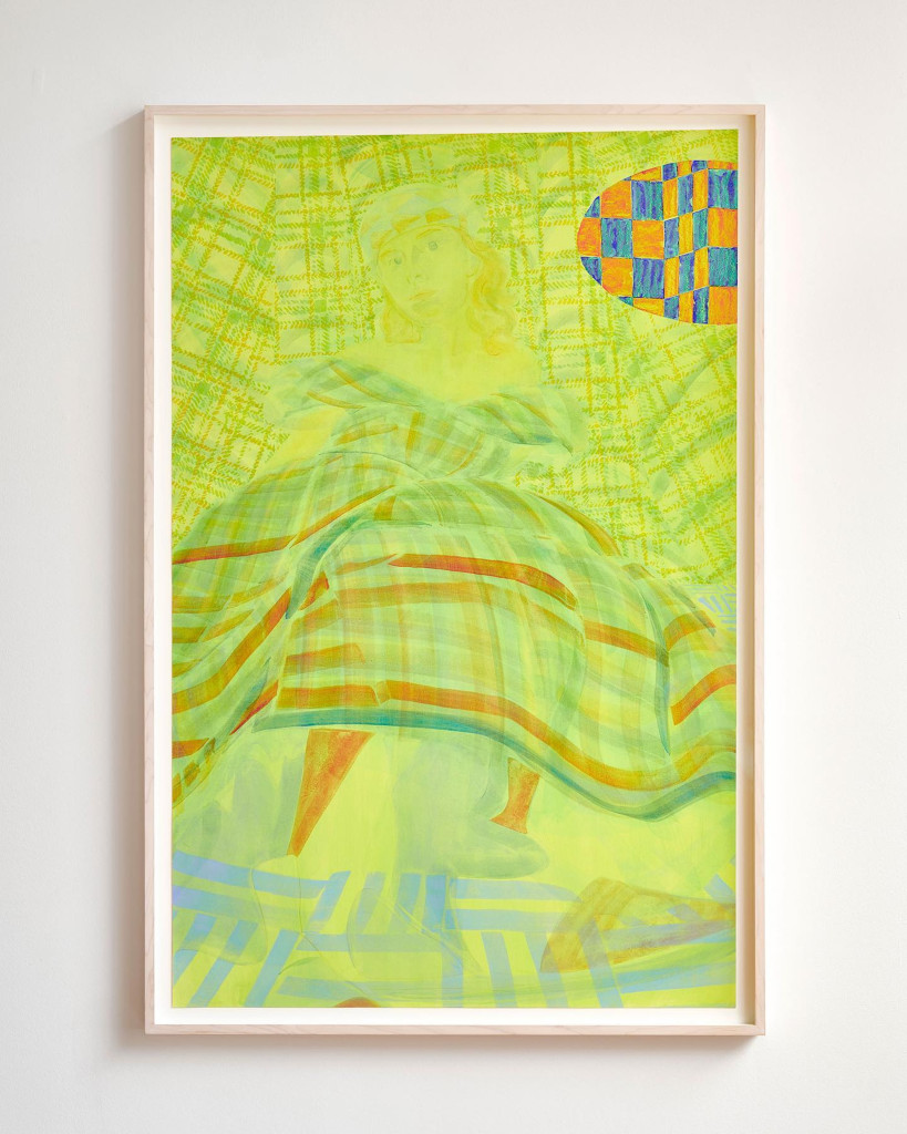 Seemingly subsumed by the dual flood of both drapery (a bedsheet, a child’s fort?) and clothing (half Renaissance courtier, half Argyle actress?), the figure has retreated into their own solitude. Whether that isolation grants peace or represents the outcome of social antagonism feels beside the point: this has become the figure’s entire world, a world constructed entirely by self-fashioning or make-believe. In Not A Toy: Fashioning Radical Characters, the world’s first comprehensive investigation into the growing influence of today’s character culture on contemporary fashion and costume design, and one of Tilson’s favourite treatises, American historian Valerie Steele celebrates the ‘element of masquerade, or “becoming” someone or something else altogether [is to] to culturally construct the self… Of course, the key element behind the idea of masquerade is the mask, providing the element of animism, or the process of attributing a soul to living and non-living entities.’ Tilson’s figures seem to embody this meaning of the masquerade. We cannot help but attribute living, breathing qualities to these character studies and yet are never fully able to see the face behind these masks of pattern, these veiled checks.