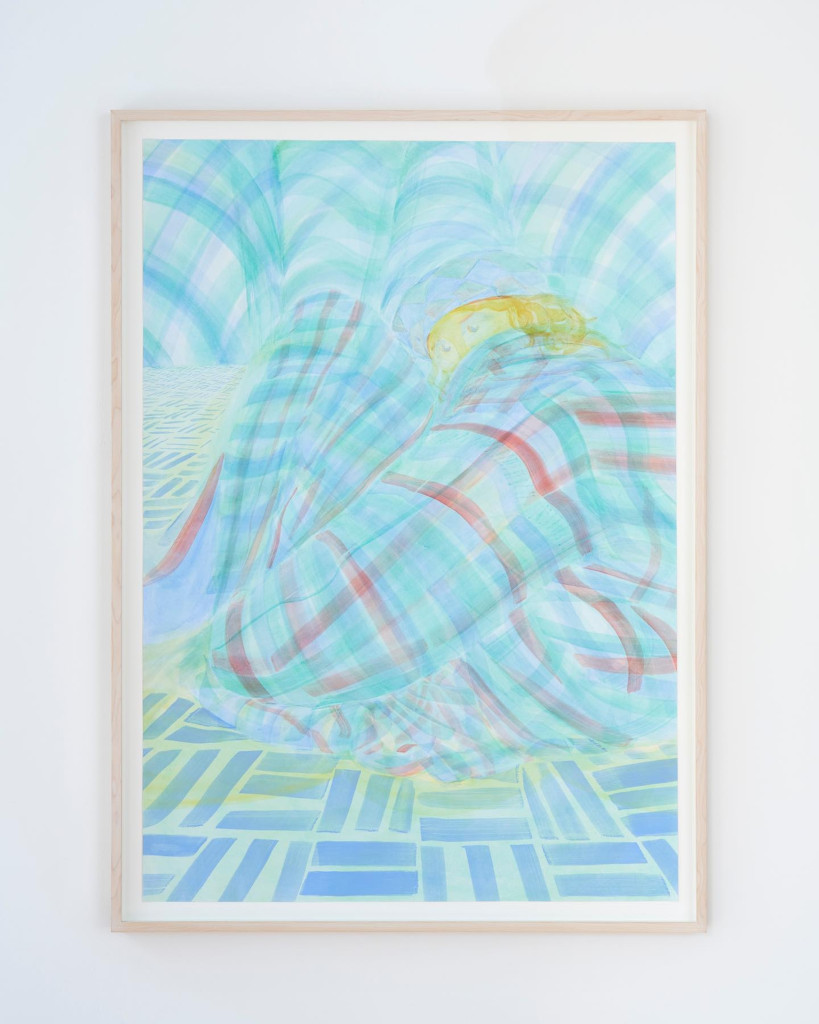 In Razzle Dazzle (2023), the seventies linoleum, which looks stretched between a kind of Moroccan camouflage and the hind patterning of a wild animal, cascades with hard edges in radioactive greens, yellow, and the deepest blues. Laid on a bed, a self-portrait of the artist—changed, altered just, transformed slightly from resemblance—confronts our impertinence. Tilson’s lino- prints are about hand-sized and sometimes incorporate up to four layers per ‘pattern.’ Here, wearing a flowing tartan dress, the figure of Razzle Dazzle gestures to Tilson’s proud Scottish heritage. When the artist took part in a residency at Palazzo Monti, in which some of the most dynamic contemporary artists gather in a 13th- century palace in Brescia for workshops, collaboration, and work, Tilson experimented with filming herself in full tartan garb: ‘I film to allow for unexpected shapes and movements to appear, non-prescribed.’ In these portraits, it feels perfectly accurate that they were originally conceived in motion. The richly textured layering of pattern, cloth, and body all feel deeply absorbed in the nature of the world transformed by time, and the very act of viewership as something always sliding in and out of focus. The tartan is the overwhelming visual principle of Her Body Thrummed (2023).