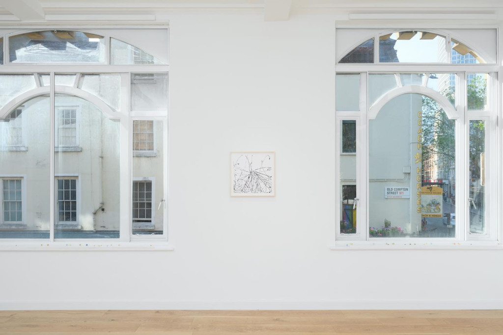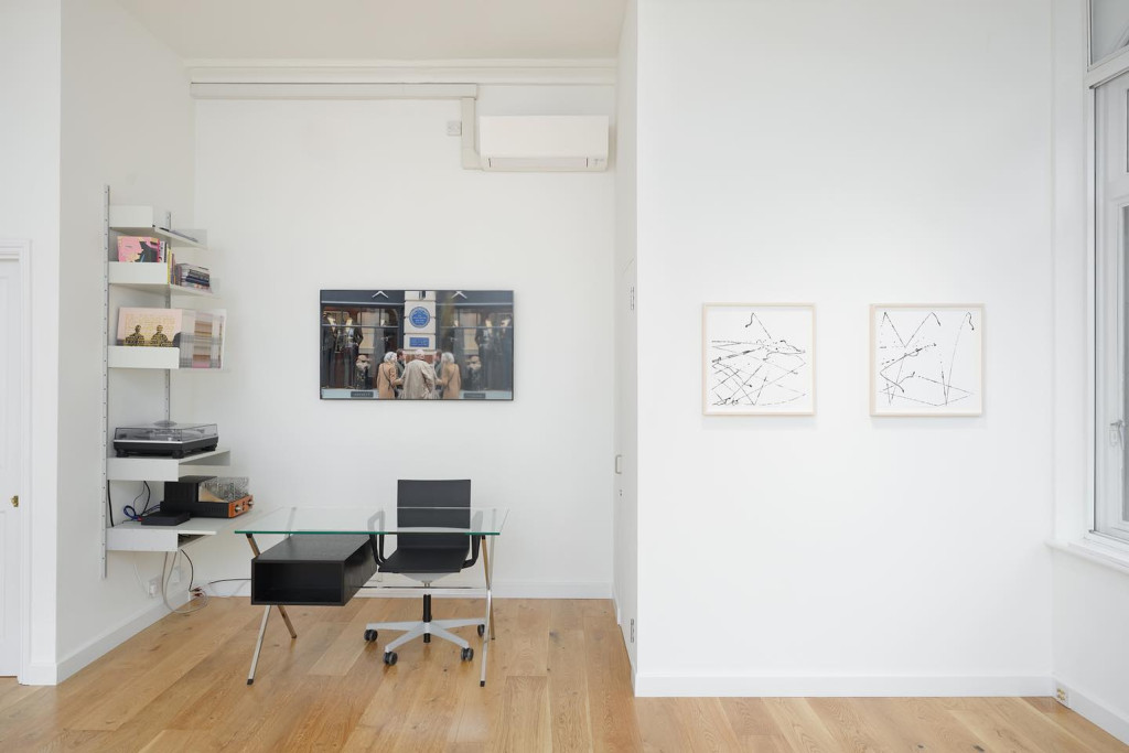 To accompany the works on paper, Wallinger has produced three new video works that reflect on the area around St. James’s. Stained Glass Window (2023) depicts the exterior view of the decorated windows on the south side of the church, which glint with the changing light marking new patterns on the other side of the Biblical narratives of Christ’s ultimate sacrifice. Optiks (2023), named after Newton’s 1704 treatise on colour and light, is another piece that speaks to the counter-side of London, away from its historic Christian devotion and as a centre of global capitalism. As seen from the cranny of a commercial arcade, Wallinger depicts the storefront of Hackett’s tailoring shop on Jermyn Street, the site of Newton’s former dwelling house and commemorated with a blue plaque. Its shop’scrossedumbrellalogosuggestsomething of Newton’s measuring compasses, such as those depicted in Blake’s monotype Newton (1795–c.1805), the video once more shows us a London that is both created by rationality and captivated by the subjective meanings of chance encounters. These videos, taken together and in dialogue with the Motion Studies, are also reminders of London’s accommodation of the sacred and the profane, the place of memory and the site of rampant individualism.