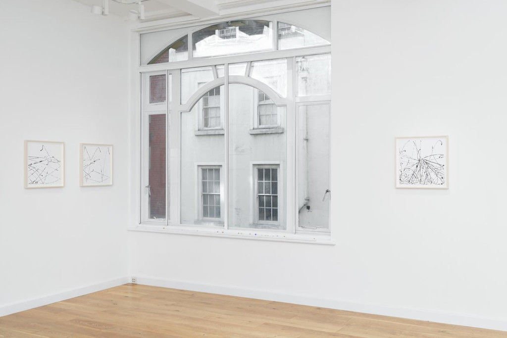The outcome of Wallinger’s experiments is dynamic; the lines restlessly reach out to the outer limits of their world while being gently contained within the logic of their reaches’ limits. Indeed, they resemble so much: the word-picture lyricism of Japanese calligraphy written in Kyoto ink; the spilt fountain pen’s porous residues on a frantically-called napkin; even, dare I say it, the gestural mark-making of Jackson Pollock, who used his Najavo sticks out on bleak autumnal days in Springs, Long Island, to dance around the canvas on the floor, creating his ‘drip’ paintings. But if Pollock was convinced that his paintings cohered to the artist’s grandiose desire to embody the unsayable order of nature, then Wallinger positions these works within the scientific tradition of the experiment: the attempt to understand the order of nature by acknowledging one’s inability to understand it in advance.