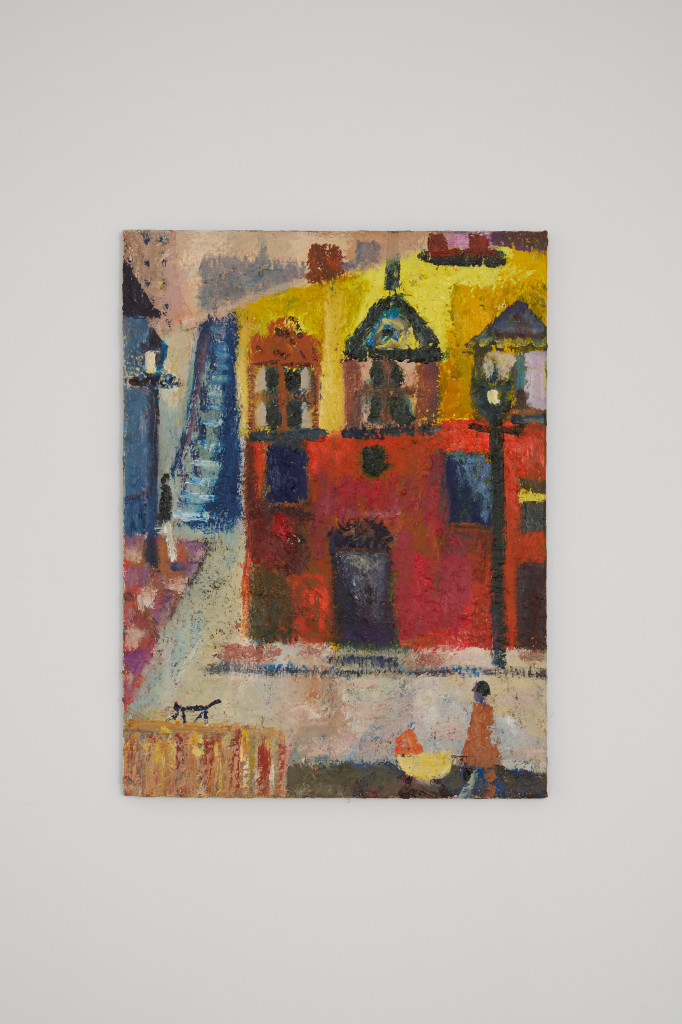 Housley was born and raised in Manchester, and clearly remembers with enthusiasm and clarity that city’s idiosyncratic architecture: its red municipal buildings, its stone and granite, its relentless grey skies. Manchester has always outgunned its place in British culture, the worker bee in its metropolitan imagination. In this vigorously pursued body of work, he has returned — imaginatively, if not in body — to his childhood in Manchester. In The Manchester Years (Little Brother Know Me Well), 2024, Housley depicts a typical Mancunian scene: a woman walks her baby in a stroller while someone else smokes a cigarette leaned against a Victorian streetlamp, both overwhelmed by an orange-red building where sordid activities are almost certainly happening on the other side of its third-floor windows. This is L.S. Lowry for the post-industrial age, an age when Manchester’s once-powerful industries have been decimated; alienation is now the rule, replacing the world that Stretford’s most cherished son observed with pithy joy. Even in Lowry’s bleakest moments, at least the factories were open, and supporters were the lifeblood of the football club; a sense of togetherness was the price paid for a diminished sense of individual agency. An inheritor of Lowry’s sensibility, Housley is one of the most perceptive of contemporary British painters not because he depicts the country as it is, but because he understands what it means to exist in a place where the imagination in the expanded sense of the word offers an exit door to that country as it is. ‘History is not merely what happened’, as Hugh Trevor-Roper wrote, ‘it is what happened in the context of what might have happened.’ Ahistorical and yet resolutely of the world, Housley’s paintings — of Manchester streets and Cheshire fields, of the cinema and visual culture of a lost England — offer a vision of what might have happened in the context of what did happen. It is for this reason that Housley’s paintings disavow the nihilism for which they might readily be accused: they are paintings of possibility more than they are documents of decay.