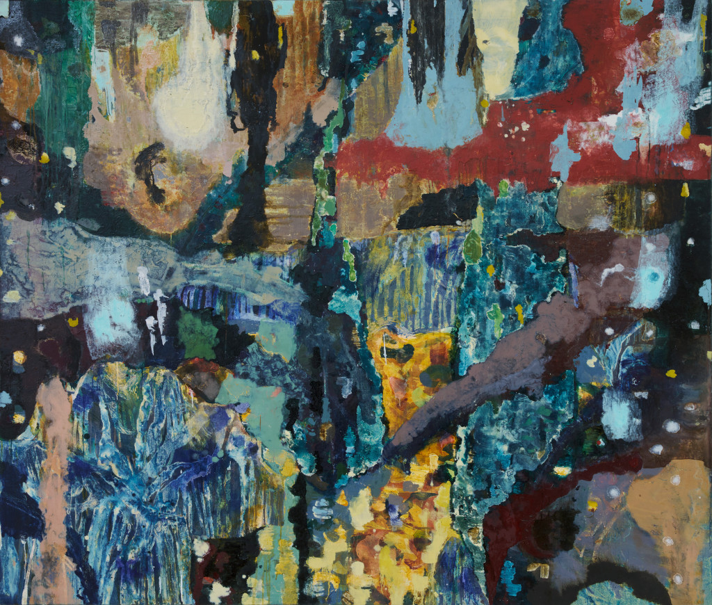 In After Image, Wright extends this association between sight and interpretation. What began as a more figuratively descriptive painting, Wright tells me, evolved into a work concerned with using the materiality of paint as a substitute for traditional figuration. A shimmering, craggy blue mass sits in the lower left quadrant of the painting. A depiction of a rock blanketed in moss became an abstract form expressive of the quiddity of a rock, the feel of plants and fungi growing out of damp and dimness. Abstraction frees Wright from her original point of reference, and other images from the natural world emerge. A choppy stream, icicles, the hanging branches of a weeping willow. Yet no single vision sticks: they appear as though reflected on water — fleetingly, dissolving and reforming. Light, depth and mass are deliberately confused, and there is little sense of whether forms are hard or soft, wet or dry, shadow or thing, flowing or motionless. All of Wright’s paintings exhibit this apposition of multiple views, rhythms, and light sources. Ambiguity prevails.