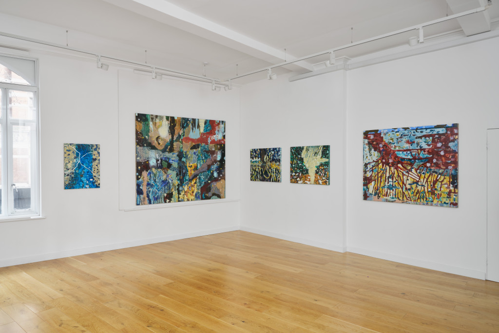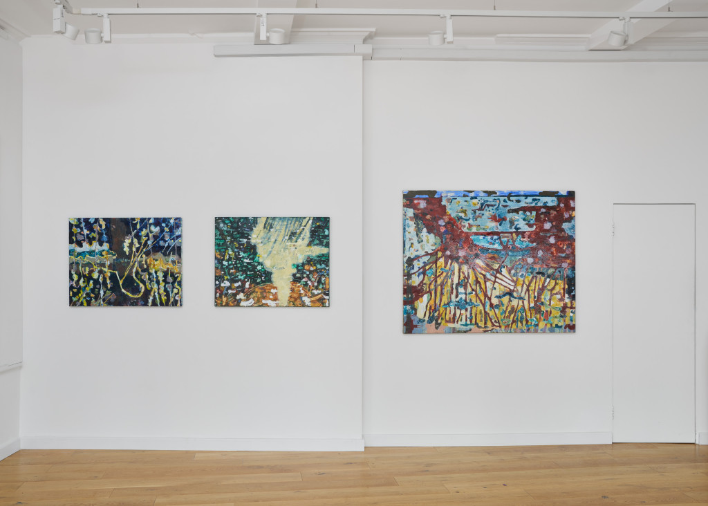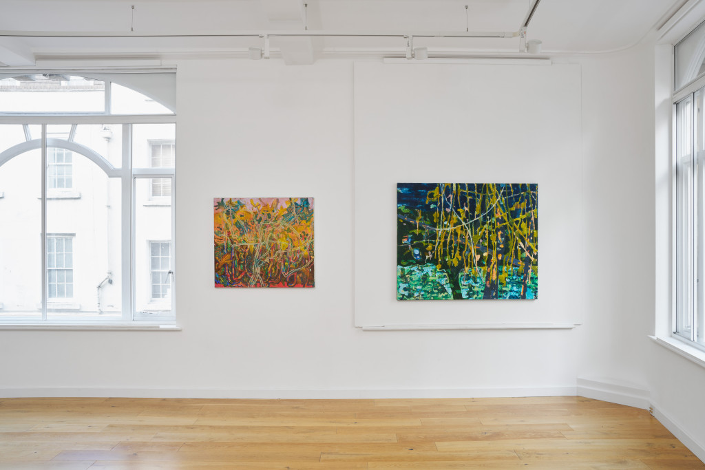For her second solo exhibition at the gallery, Ella Wright presents a body of new paintings which find imaginative potential in the otherwise overlooked. Informed by direct observations, fragments of found photographs and dissected film stills, the works act as fractured reflections of her immediate surroundings. Wright zooms in: small zones of ‘unwanted’ growth, branches knotted in power cables, fluorescent light in suburban rivers, moss, lichen and textures in rock and mineral. Through her process of painting, this slippery, vegetal matter becomes abstracted, inviting us to see afresh, as new, unexpected images are revealed.