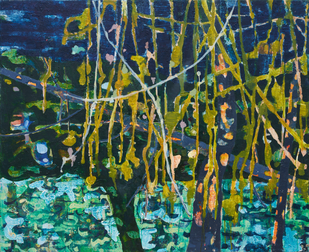 The title of After Image refers to optical phenomena, and it is not the only painting amongst this group to reference the physiological aspects of vision. Double could be split down its middle to reveal an uneven, wavering mirror image, and imitates the effects of double vision. Perceptual distortions and confounding reflections also characterise Street and Night Shoot. In Tumble, the branches of a tree appear to flower with reflected light, and the blurred forms beneath arise as though from an eye squinting against the sun. In Clearing, light ripples and clots over what appears to be a wooded area in a fusing of different scales, vantage points and fields of vision that draws attention to the mechanisms of sight. Associations are made in several paintings between the eye and the camera lens, which operate in analogous ways. The green patina of Night Shoot responds to, Wright explains, the colour of street light in film from the 1970s — a combined result of mercury vapour bulbs and the film stock of the time. The colour reappears, slightly altered, with an echo of this cinematic association, in Street, Still Light and Crossing. Crossing develops this exploration of light out from the human visual system (and technologies designed to mimic it) to the optical effects and processes of a wide variety of organisms. This painting was born out of Wright’s interest in bioluminescence. The luminous greens and yellows of Crossing bring to mind creatures and algae capable of radiating light, most of which reside in the sea. Crossing allows the viewer to occupy both a conventional vantage point, gazing upright out a window onto scenery, and a horizontal, underwater stance, as though snorkelling through a patch of bio-diverse ocean.