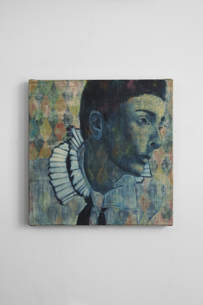 For Tessellations, Berman has produced eight works, split between four paintings and four works on paper; Tilson has made nine paintings. Variations on a theme, Berman’s untitled works on paper are enigmatic and virtuosic. In some versions, the androgynous figure—herself, or someone like herself—is dressed in a ruff, like a Tudor courtesan vying for the attention of a Queen, or else call to mind an actor on the Shakespearean stage, when boys played girls, and the audience were privy to those jokes, insults, and secrets that were kept from unsuspecting characters. Berman’s works, whether the works on paper or the oils, all radiate with the sense of secret-keeping. Despite their monochromatic form, Berman’s self-portraits resemble the pose and posture of the art collages by New York-based Susan Cianciolo, whose intuitive, craft-oriented practice incorporates glossy fashion magazine cut-outs with highly personal associations, which lend both a new tenor of exposure and intimacy. This atmosphere of secret-keeping and code-switching gestures back at least as far as the Renaissance, and to one figure in particular. The comic servant character Harlequin, from the Italian commedia dell’arte, who is characterized by his checkered costume, is central to the work of both artists. Appropriated by Pablo Picasso and other modernists, Harlequin was valued as a trickster and code-switcher who uses wit and resourcefulness to outwit the powerful, often by using a batte, or ‘slapstick’, to change the scenery of the play. It is important to note that Tilson’s Etched in her Face (2024) is paired in the gallery space with Berman’s Renaissance Man 3 (2024).