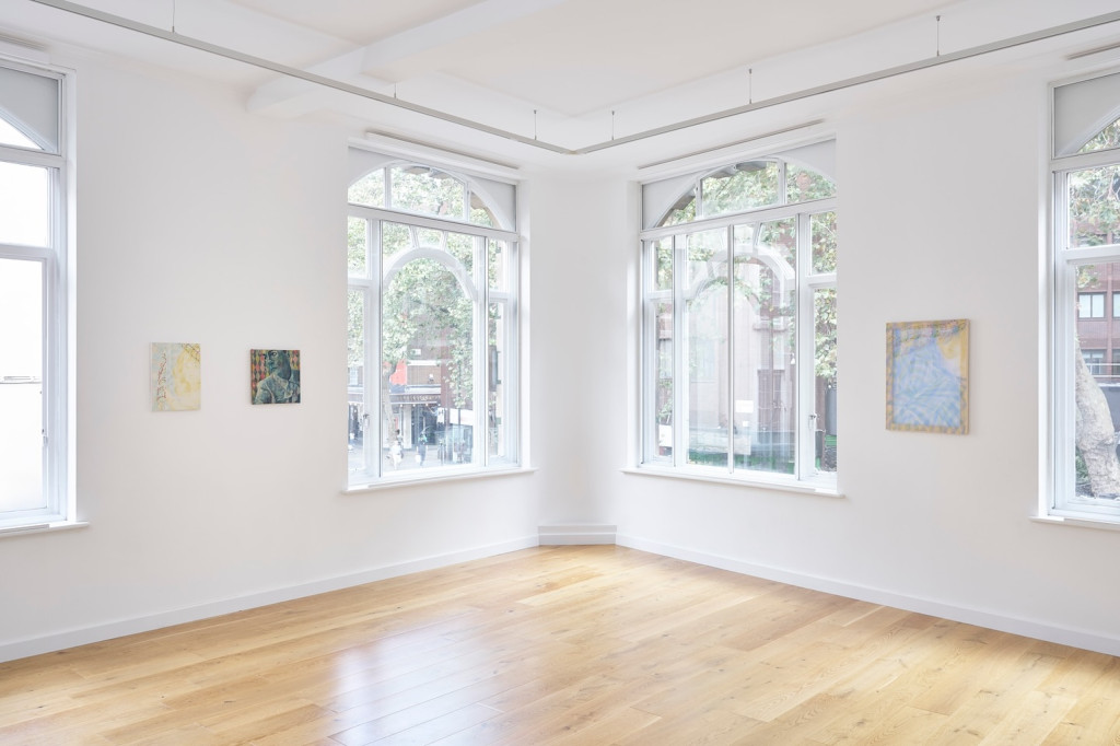 Tessellations is an event that far exceeds the rudimentary framework of the conventional two-person show. This exhibition is very much in the tradition of the collaborative display as opposed to the curated group format: think of those enfants terribles of 1980s German art, Albert Oehlen and Martin Kippenberger, who worked with cheeky puckish humour on collaged works, often punky takes on fashion; or, around the same time, in New York, the two-person shows staged by Andy Warhol and Jean-Michel Basquiat on Bruno Bischofberger’s dime. Like Warhol and Basquiat, an established artist and a young talent, Berman and Tilson are a fascinating pair: first introduced by Alvaro Barrington, their work revels in the exciting possibilities for the revelation and concealment of the self in portraiture, in vibrant and polychromatic pattern-making, and in the sense that the female gaze—looking out, being looked at—can be many things simultaneously: seductive, decisive, vulnerable, and stylish.
