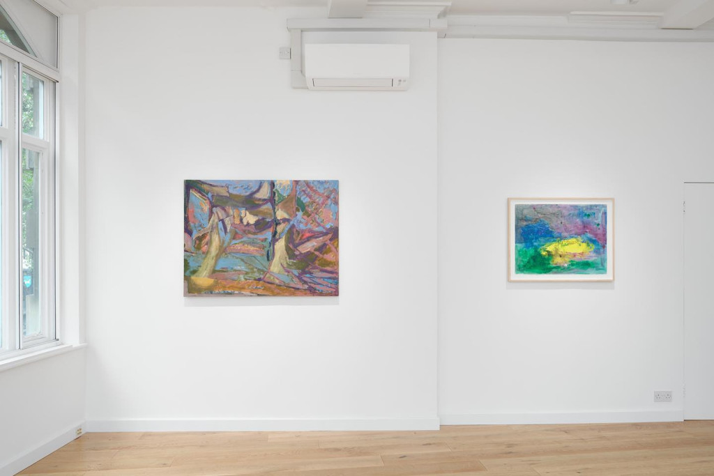 Field Edge is a majestic example of James Ferguson-Rose’s ability to conflate the past and present. The work presents us with two hedgerow tree trunks, their fractured silhouettes give way to a patchwork of abstracted, angular forms. Surrounding the trees, a pattern of linear shapes suggests a mesh of branches, meanwhile flashes of sky blue and mauve recall a hazy horizon, hinting to the glow of twilight or fogginess of dawn. A keen wayfarer outside the studio, Ferguson-Rose documents the landscapes he encounters in the English countryside. In Field Edge, he presents us with the record of several journeys through Northumberland, depicting in part what he recalls as a ‘quiet, unremarkable field in a quiet, unremarkable corner’ of the Northern county. Quick and stifled, the brushstrokes lend the work an otherworldly quality, a device which suggests the haziness of memory. ‘This painting is not about stillness and being in one place’, Ferguson-Rose comments, ‘It is a record of … the constantly moving landscape that defines them, with the paintings taking the journey again and again, growing over time in the studio until they settle as somewhere I know that I have been and experienced’. Equally inspired by his immediate surroundings— in this case the urban landscape of South East London where he lives and works—is British artist Neill Kidgell. For Kidgell, however, elements from the outside world function as mere catalysts for the process of making, the work’s visual effect taking precedence over its subject matter and source material. Indeed, this self-referential approach manifests poignantly in Obstacle and Weather Painting 2, works in which the artist’s complete painting process—replete with traces of erasure, accidents and reworking—is laid bare. Rendered on an intimate scale, Obstacle presents us with an array of clustered fragments, the angular orange form at the centre recalling a plastic construction barrier found on the street. Despite its quasi-familiar shape, this form came about accidentally, reflecting Kidgell’s process of painting with no plan or end point in mind. In Weather Painting 2, we are presented with an equally alluring mosaic of forms, their simple, geometric shapes straddling abstraction and representation. ‘The compositions often look like a collection of fragments, a detail of a larger image, or suggest environments, structures and objects glimpsed or caught in a state of change or transition’, Kidgell comments, ‘Through this approach to my practice, I explore the relationships between recognition and ambiguity, intuitive and conscious gestures, and painting and drawing as material thing and image’.