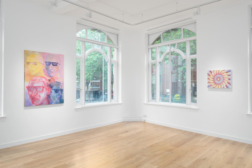 Also employing simple pictorial tools in his practice is artist Alex Gibbs. In Pick a direction, walk in it, get lost, find yourself again, Gibbs presents us with a portrait of himself sporting a pair of Wayfarer sunglasses, his visage pasted in bright yellow, pastel pink, maroon and midnight blue across each quadrant of the picture plane. Here, contrasting colours are employed as a means of categorisation, enabling him to present multiple versions or identities of oneself. Based on a period he spent in Seoul with his family at the end of 2021, the work is inspired by walks the artist took around the city with his three-month- old son Ivor, usually drifting him off to sleep. Each day, he would step out the door, choose a direction, start walking, get lost, and find himself again. A self-confessed nomad, Gibbs’ aimless strolls around Seoul recall Ferguson- Rose’s journeys across Northumberland, both artists swept away by the magnitude of their surroundings. ‘It was a wonderful way to see the city’, Gibbs proclaims, ‘This then became a song that I would sing to [my son]. I had many such songs. Though the song referred to locating oneself geographically, using it as the title of this painting creates the suggestion of finding oneself spiritually’. A lover of music, and an avid musician himself, Gibbs’ English Whimsy and Me is a painting based on British 1980s and ‘90s rock music. Rendered in a vivid, hallucinatory colour palette, the work presents us with Genesis members Peter Gabriel and Phil Collins, a generic ‘90s guitar player and another character, later confessed to be Gibbs himself. Here, Collins sports a bright yellow Hawaiian shirt, meanwhile Gabriel appears as one of his alter-egos Magog, sporting the red headpiece he wore at the end of the song Supper’s Ready. ‘I like music and painting that brings out feelings in me’, Gibbs once told Cedric Bardawil, ‘That is not all the music and painting that I like, of course, but it is a special—and persuasive—force within me. That it then seeps into the paintings I make is only natural’.