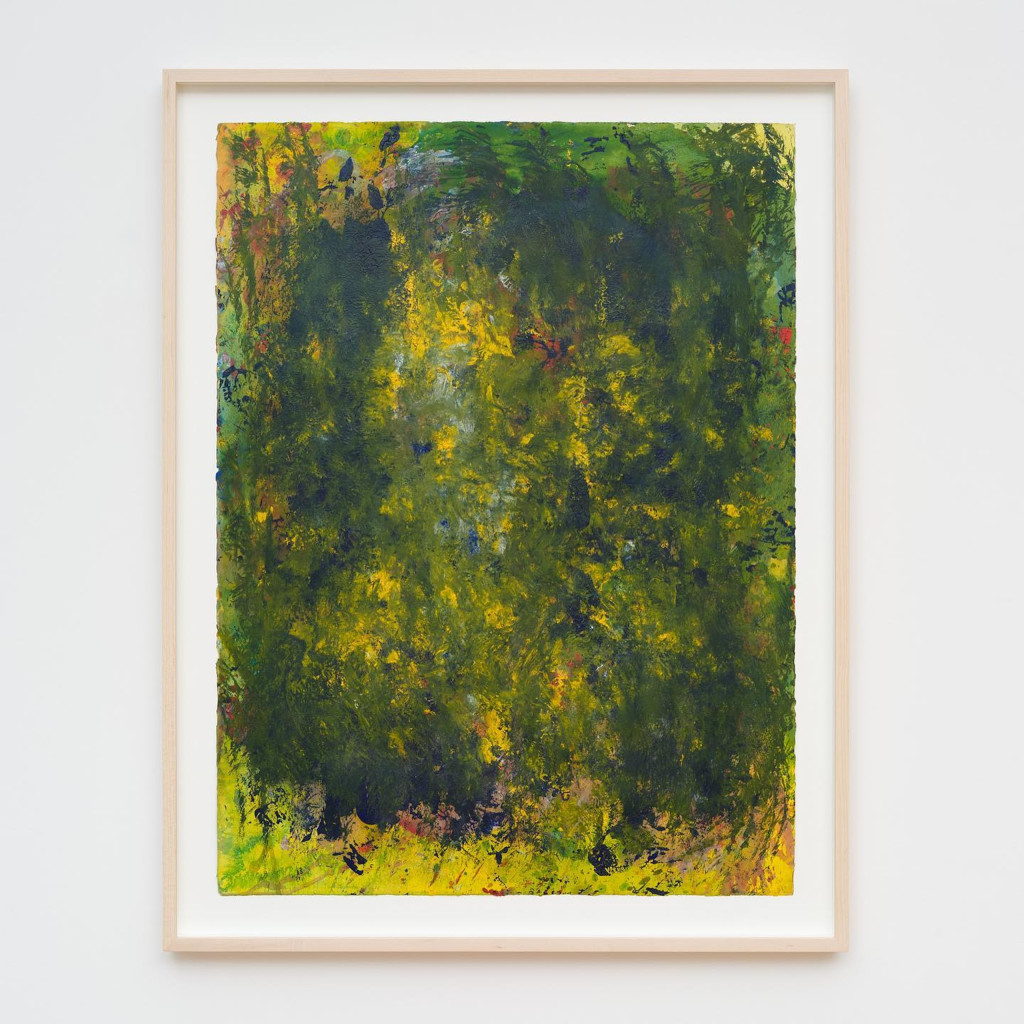 In Untitled V, Branch develops a crisscrossing matrix of full-armed sweeps in the left field, a cacophony of vegetal greens overlaying ochre, while in the centre ground, a thrilling addition of luscious yellows compete for space and, in turn, offer an extraordinary pattern like the vague dispersals of a calligraphy master’s Rorschach test. In Untitled VI, one of the two monoprints, Branch has constructed such a dense conglomeration of paint that the dominant cobalt blue form, which is positioned centrally and heightened, appears to sit above the surface while the sheer depths of its total environment flickers with life.