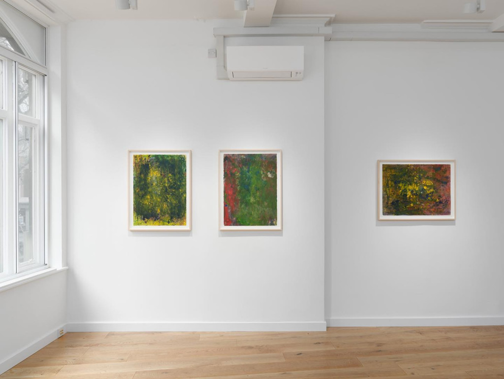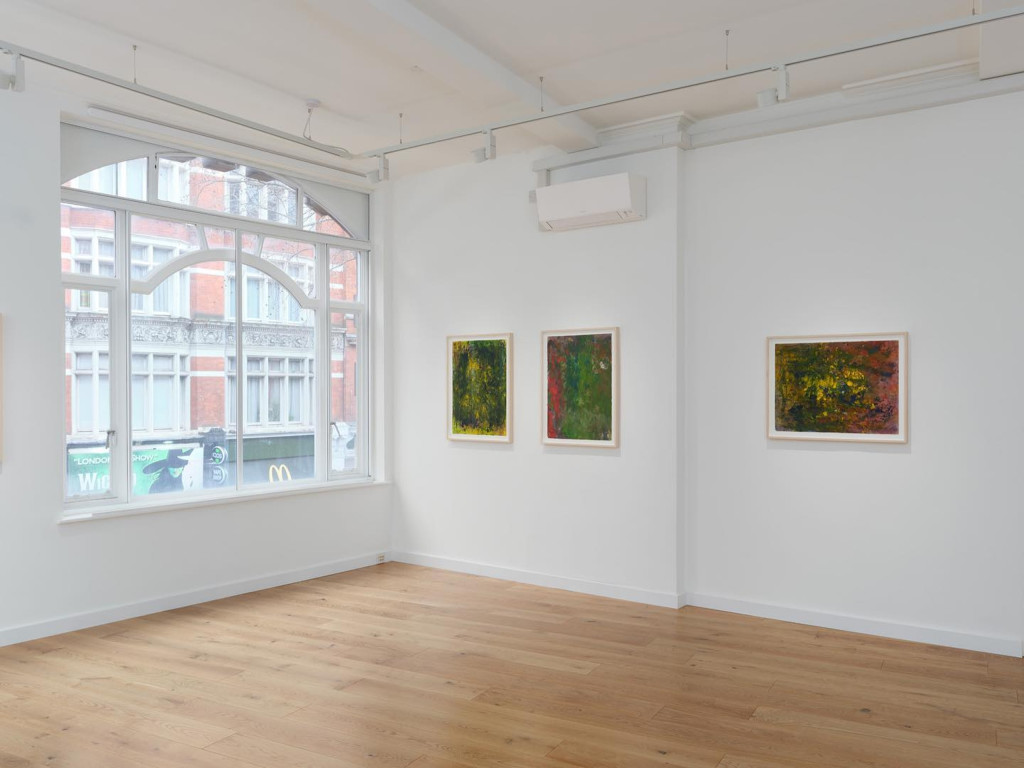 From a distance, these works flummox evaluation. Their composition oscillates between a period vogue of post-war painterly abstraction – comparative, you might say, to Frank Bowling and Auerbach – as well as the searing arcadian dreams of Claude Monet’s late style, his grande decorations. But Branch’s mode of painterly abstraction is inspired by his own relationship to nature, borne from but extending beyond his relationship to space –– not only to ‘nature’, which has its own abstractions in definition, but also to the spit and sawdust of the cities where he lives and has lived, in London, Berlin, Oakland, and Rome.